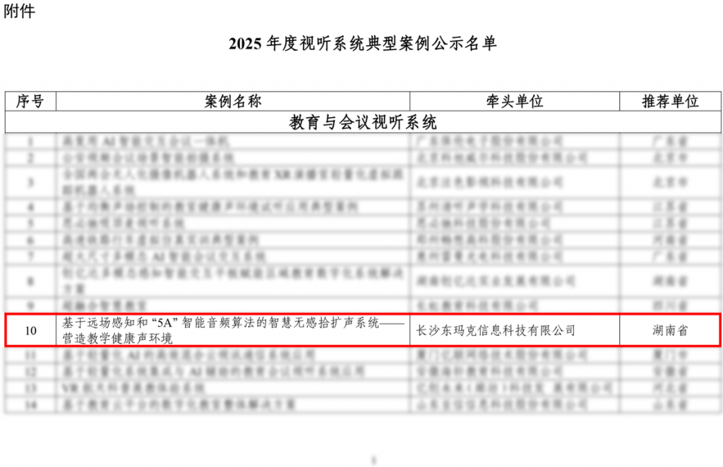近日,由工业和信息化部、文化和旅游部、国家广播电视总局、国家知识产权局、中央广播电视总台联合评审的2025年度视听系统典型案例入选名单进行了公示,全国仅86家。东玛克申报的【基于远场感知和“5A”智能音频算法的智慧无感拾扩声系统——营造教学健康声环境】凭借技术创新与应用价值成功入选。据悉,此次入选的典型案例中,与教学健康声环境直接相关的典型案例包括东玛克在内全国仅有2家。