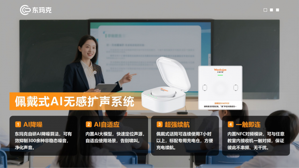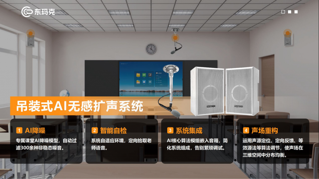 东玛克作为教育信息化全栈声效解决方案供应商,掌握了远场音频信号处理的核心技术,自研的智慧无感拾扩声系统以远场感知阵列和5A智能音频算法为核心,实现了教室场景下的远距离拾音与无感扩声,为师生提供均衡清晰的高质量增强语音,有效保护老师嗓子健康和学生听力健康,提升教学质量,营造教学健康声环境。据悉,东玛克的无感扩声系统相关产品目前在国内已有10000+案例应用。